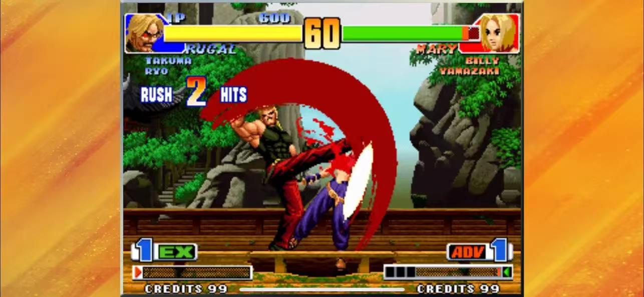 集系列首作『拳皇 94』至超人气前作『拳皇 97』之大成、实现了系列中最平衡的对战系统。搭载[ADVANCED MODE]与[EXTRA MODE]两种操作模式。更有装入“练习模式”。总有一种适合您!