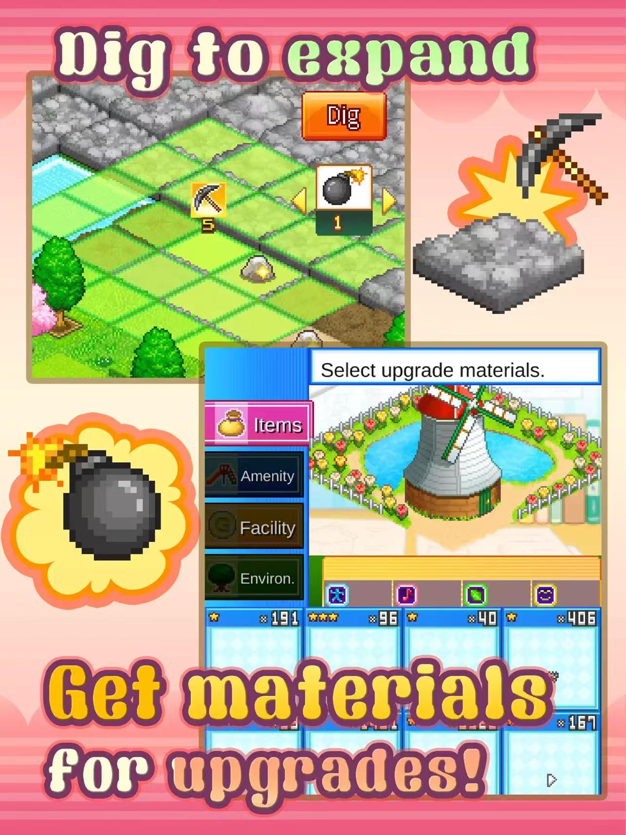 当你开始空间不足时,拿起镐子扩展可用土地,并在过程中找到各种材料。这些材料可以用来升级你的设施,甚至制作特殊物品!