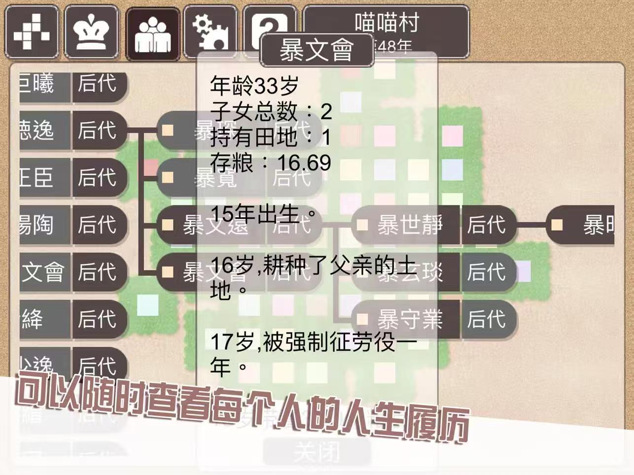点开游戏中每个居民的人生履历,可以看到他们的一生是如何被政策所影响。原本守着自己仅有的一块地刚刚好自给自足的人,由于被强征劳役数年,回到家的时候发现已经没有足够的储蓄养活自己和自己的孩子,于是只能卖掉了自己的田地成为佃农;住在人口稠密的地方却没有田地继承权的次子在独立之后发现没有荒地可以让他开垦也找不到佃农的工作,然而宽松的税率让大家手头都很宽裕,于是他做了几年学徒后成为了一个为周围的人提供服务的手工业者,就此过上了富裕的生活;在田税宽松的时候买入和开垦了大量土地的地主面对突然变得过于严苛的田税只能抛售自己的土地,然而却在邻居中也找不到买家……发现自己修改的那些数字是如何实际的影响了一些人的生活和决策,大概是这个游戏最有意思的地方。