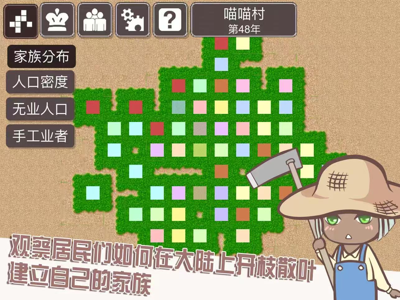 于是我做了这个游戏,游戏中我将几个农民扔到一片不加限制的荒地中,农民会自己去开垦和耕种土地,生育子女,积攒家产,当然在手头宽裕的时候他们也会偷懒休息,将土地租给佃户去耕种,或是购买手工业者如面包师,铁匠的服务来提升自己的生活质量。他们甚至会随着周围邻居的收入来决定自己是做农民还是成为一个手工业者。当所住的地方难以找到工作时,他们会试着搬家来寻找更好的生活。当失去了所有储蓄和田地毫无希望时,他们则会加入叛军劫掠国库。