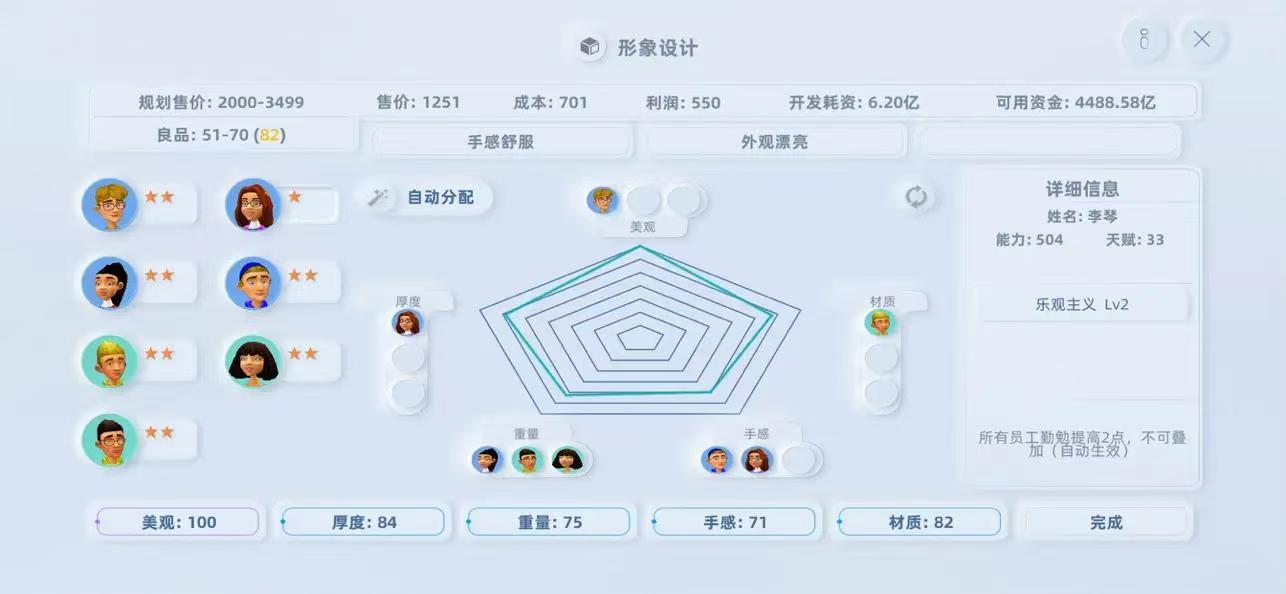 《手机帝国》的核心玩法是研发更好的图纸、升级更牛的科技、打造更强的团队、研发更好的手机、赚取更多的利润,如此循环。而“如何用人”是整个游戏的精髓所在,根据员工的能力、天赋和技能,把合适的员工放到合适的岗位才会发挥出其最大潜能。员工的配合还会触发团队突破效果,这是一个可以让你突破科技限制从而创造奇迹的新机制。