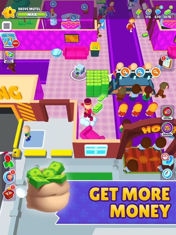 • 设施是关键:通过确保酒店具备所有可用的设施,来最大化利润并获得更多的资金来投资于这个有趣的模拟器。浴室是第一步,但努力工作,你很快就有机会在你的物业中添加自动售货机、餐厅、停车场和游泳池。客人将为每个设施支付额外费用,从而增加你的收入。不过,请记住,每个设施也需要配备人员,所以赶快招聘,否则你将很快忙不过来,而愤怒的客人将排队等待每个设施。
