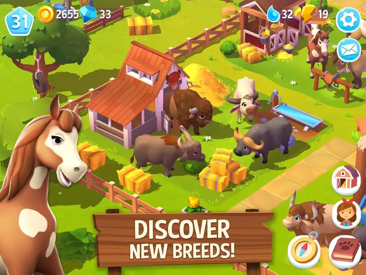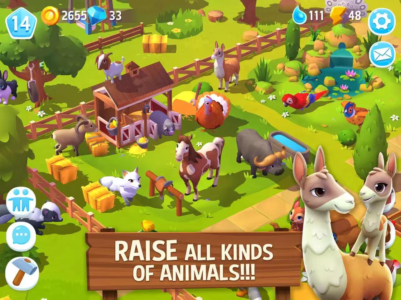 • 畜养动物幼崽并发现新的动物品种,例如施泰因鹅、鸸鹋、图丹卡牛、蓝孔雀、几内亚黑猪、波旁火鸡以及绯红金刚鹦鹉。此游戏可免费游玩,每个新品种可生产稀有农场商品以帮助你壮大农场。