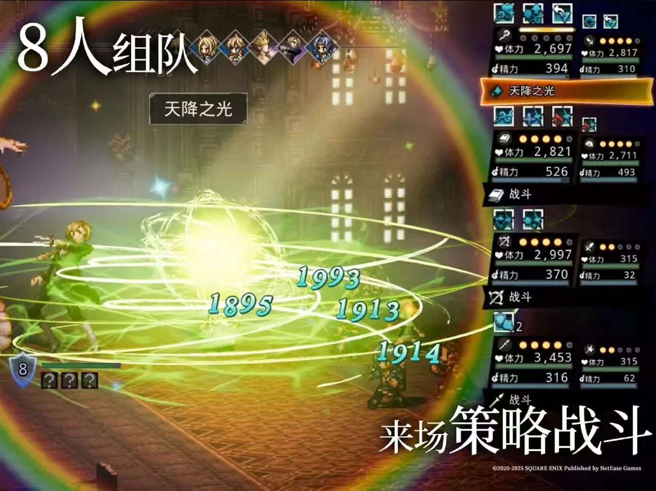 8名角色分为前后排作战,为战斗策略提供更大空间。
