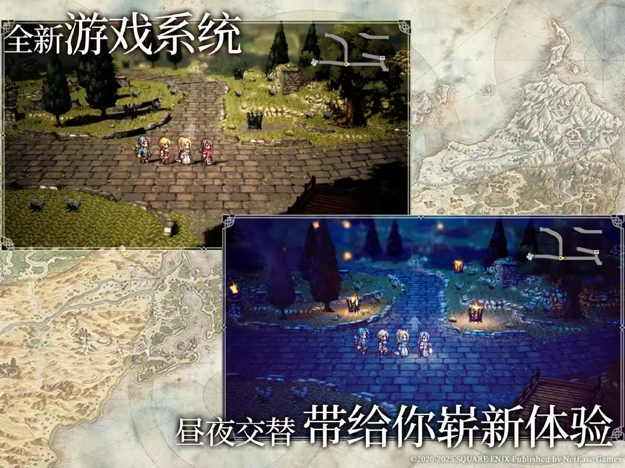 画面延续了前作的像素HD-2D幻想风,并将3DCG的视觉效果与像素艺术结合,展现出梦幻的游戏世界。在日服原版基础上,国服更是将美术表现提升至与主机版一代作品水平,开放60帧选项,提供720P、1080P,不同镜头远近选项,满足玩家个性化需求。