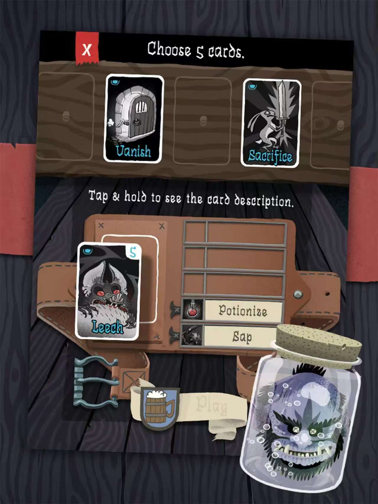 通过使用物品卡牌,击杀怪物卡牌和管理有限背包空间,玩家可以清除54张地牢卡牌。每一轮游戏,玩家可以使用5张技能卡牌(迷你卡牌桌)来获得特殊技能。玩家还可以积累金币来解锁其余35张技能卡牌,以便学习更高级的策略,获取更高的分数。