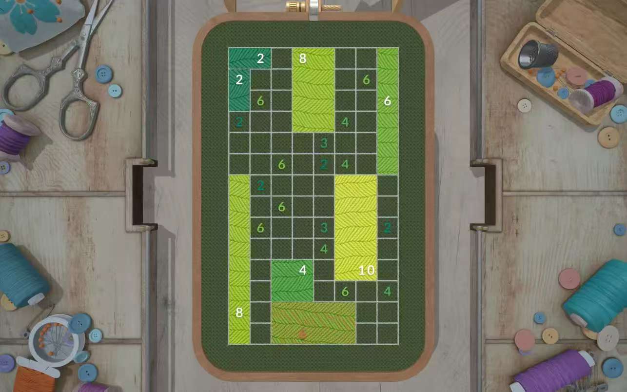 Stitch. 是一款在编号网格内刺绣的休闲益智游戏。主要目标是填满各关卡的区块,不留空隙并完成刺绣圈。