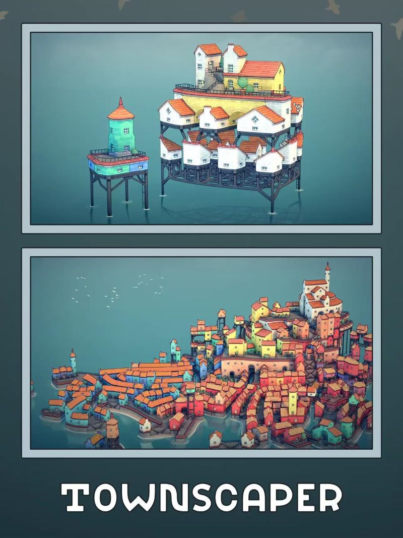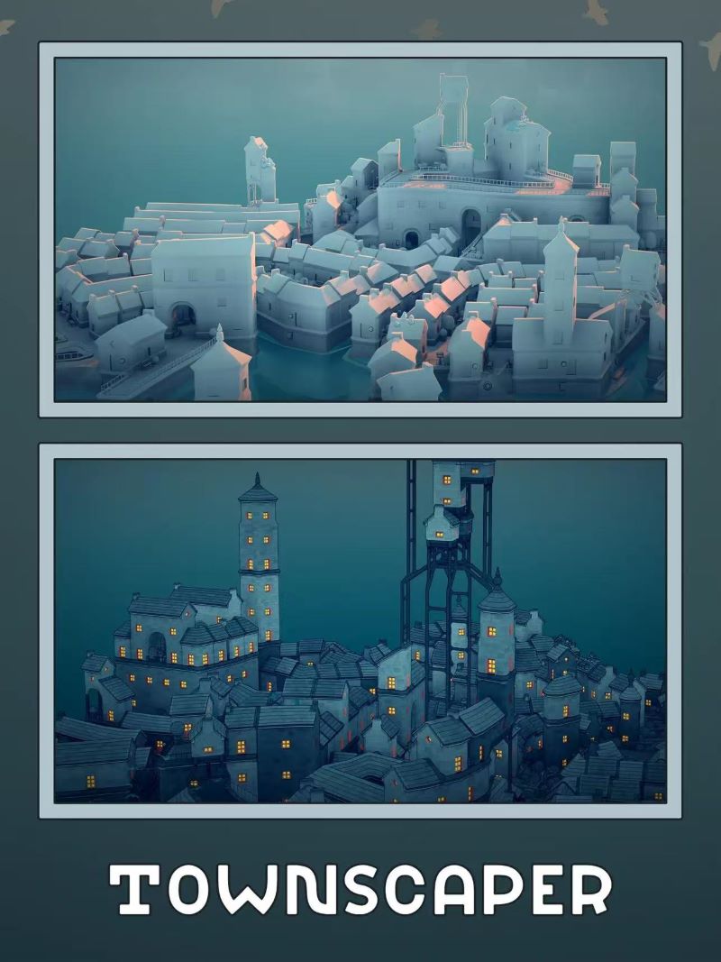 Townscaper是一个实验性项目。与其说是游戏其实它更像玩具。我们可以从调色板拾取颜色,选个房子色块放在不规则的格子里,然后看{Townscaper}的底层算法如何根据不同的配置自动地将这些色块变成可爱的小房子、拱门、楼梯、桥梁以及郁郁葱葱的后院。